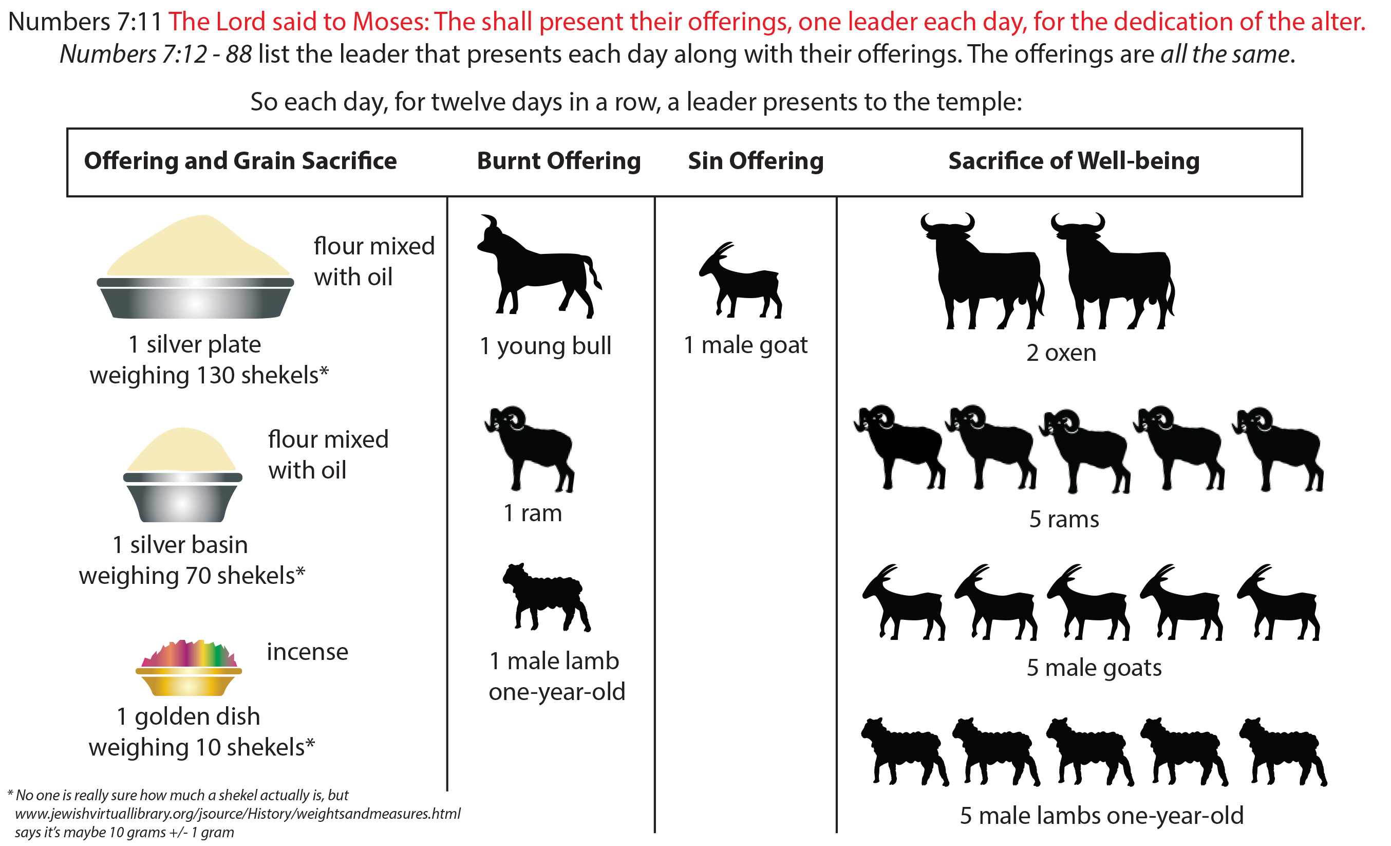 The donations ledger was both detailed and incredibly repetitive. Each day for twelve days, the exact same offerings/sacrifices were made, in the same order and for the same amounts. And over the course of 77 verses, those offerings/sacrifices were listed twelve times. I decided that this needed an infographic too, so I’ve included one below: