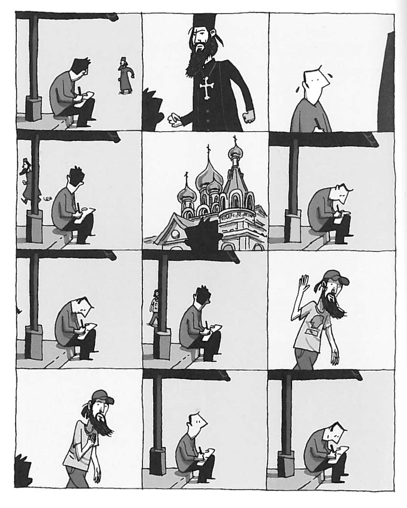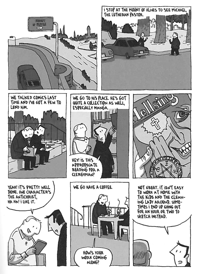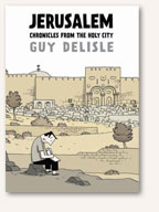 Book cover: JerusalemJerusalem is about twice as long as Delisle’s previous books, which is explained toward the beginning when he describes how he and his family are moving to Jerusalem for an entire year for his wife’s work for Doctors Without Borders. By this point, he has made enough of a name for himself as an author that he is spending the year solely working on this graphic novel, while also taking care of the children and doing the occasional lecture.